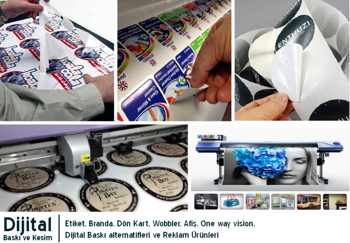 Şekilli kesimli etiketler, folyo, vinil, flama tekstilleri, kanvas, branda, dön kart, wobbler, afiş, one way vision, iç mekan dış mekan folyo baskılar, poster baskılar, reklam ürünleri baskıları
